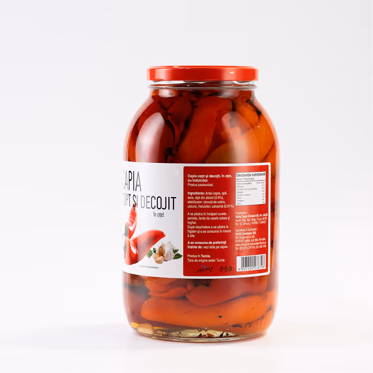 Ardei Capia Copt și Decojit, întregi, în borcan de sticlă 3000 ml. Volum mare, textură moale și gust savuros – soluție profesională pentru restaurante și catering.