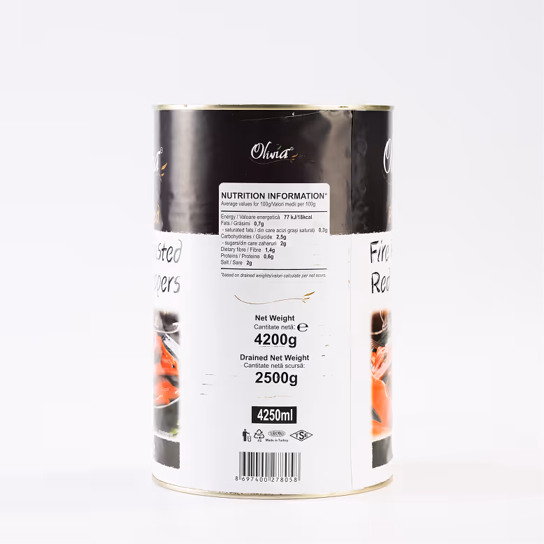 Ardei capia copți și decojiți felii OLIVIA, cutie metalică 4250 ml. Gust dulce, textură fragedă și volum generos – soluție profesională pentru salate, platouri și rețete HORECA.