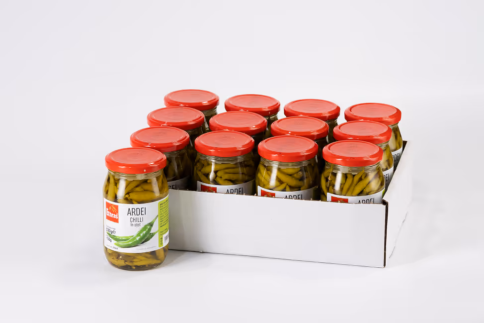 Ardei iute CHILLI întreg, în oțet, ambalat în borcan de sticlă de 370 ml. Gust intens, textură crocantă, ideal pentru aperitive și platouri reci. Calitate superioară Ethras.