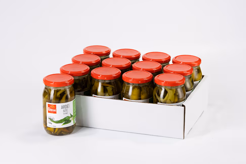 Ardei Pfefferoni întregi, în oțet, ambalați în borcan de sticlă de 370 ml. Gust ușor picant, textură crocantă, perfect pentru salate, sandwichuri și platouri reci. Calitate Ethras.
