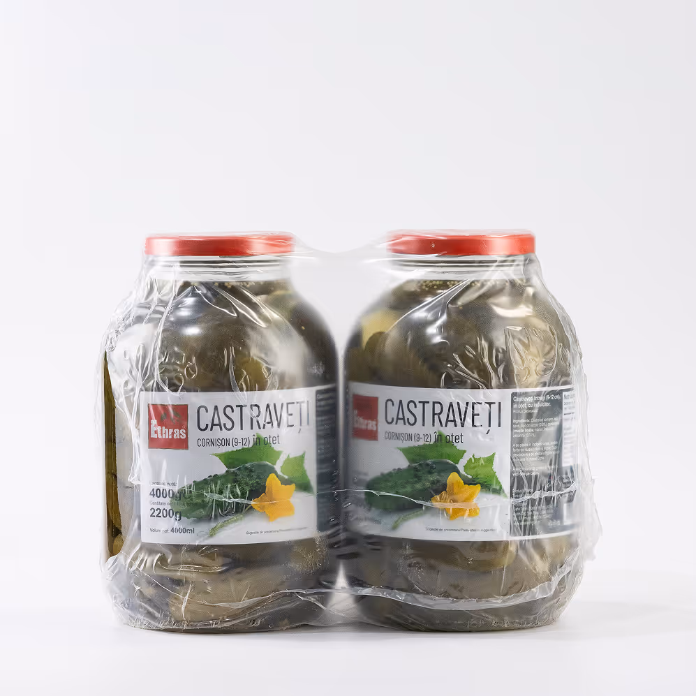 Castraveții întregi în oțet Ethras, calibru 9-12 cm, sunt selecționați atent pentru dimensiunea lor uniformă și textura crocantă. Ambalați în borcan de sticlă de 4.000 ml, cu masă netă de 4.230 g și masă scursă de 2.200 g, acești castraveți sunt ideali pentru restaurante, catering și sectorul horeca.