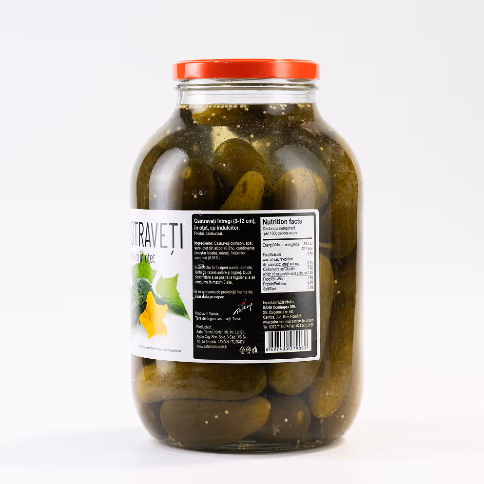 Castraveți întregi în oțet, calibru 9-12, ambalați în borcan de sticlă de 4250 ml. Textură crocantă, volum generos, ideali pentru restaurante, catering și servire profesională.
