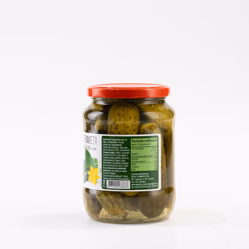 Castraveți întregi în oțet, calibru 6–9, ambalați în borcan de sticlă de 720 ml. Textură crocantă, gust echilibrat, ideali pentru aperitive și garnituri.