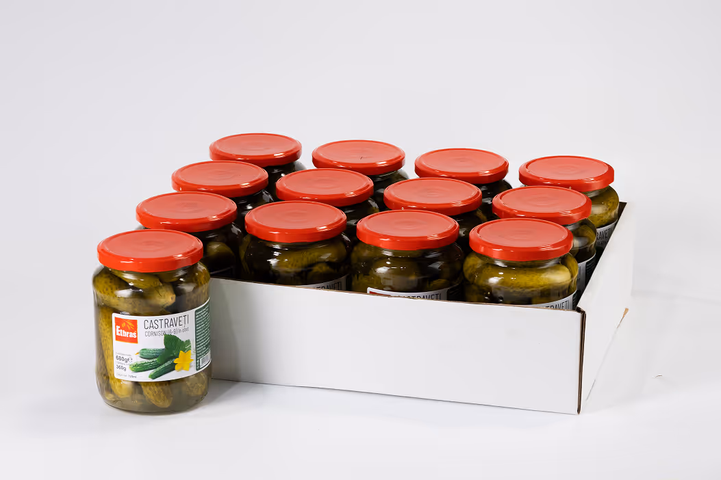 Ambalajul din sticlă păstrează prospețimea și textura fermă a castraveților, iar formatul este optim pentru uz casnic și retail. Garanție extinsă de 24 luni, livrare în baxuri de 12 bucăți (64 baxuri pe palet), pentru aprovizionare eficientă și stoc optim.