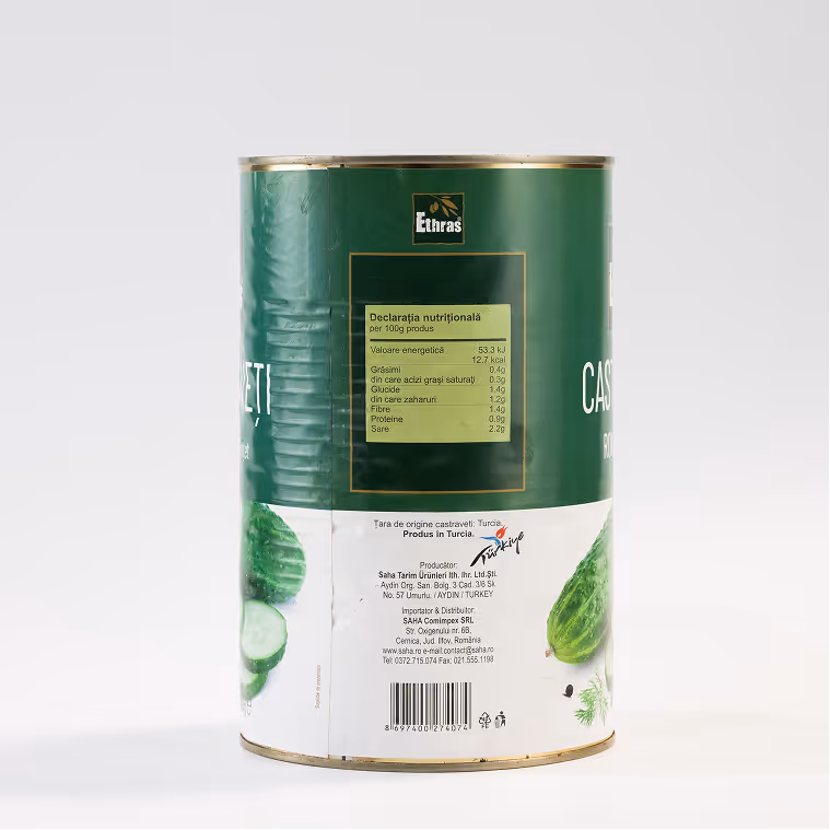 Ambalajul metalic menține prospețimea, gustul echilibrat și textura crocantă a castraveților, iar volumul generos optimizează fluxul de lucru în bucătăriile mari. Se livrează individual (1/bax), 175 baxuri pe palet, pentru aprovizionare eficientă. Garanție de 24 luni, calitate constantă pentru sectorul HORECA.