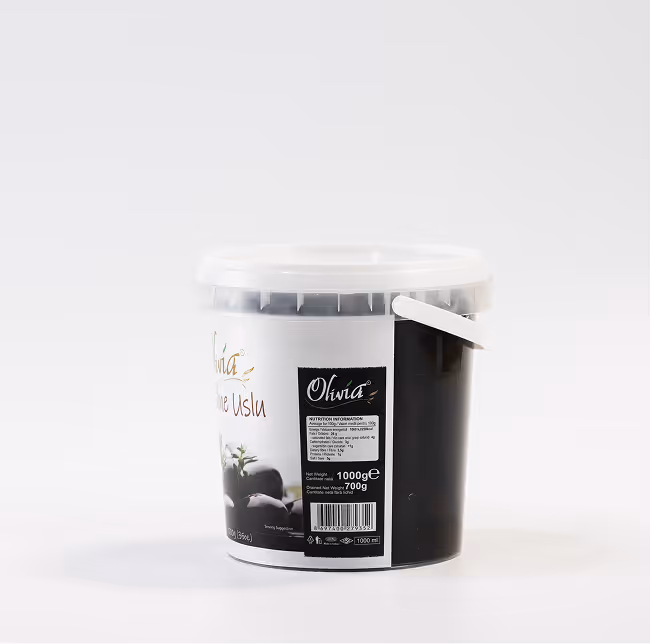 Măsline naturale întregi, ambalate în găleată plastic 1000 ml. Gust autentic, textură fermă, ideale pentru gustări sănătoase, salate și platouri aperitiv.
