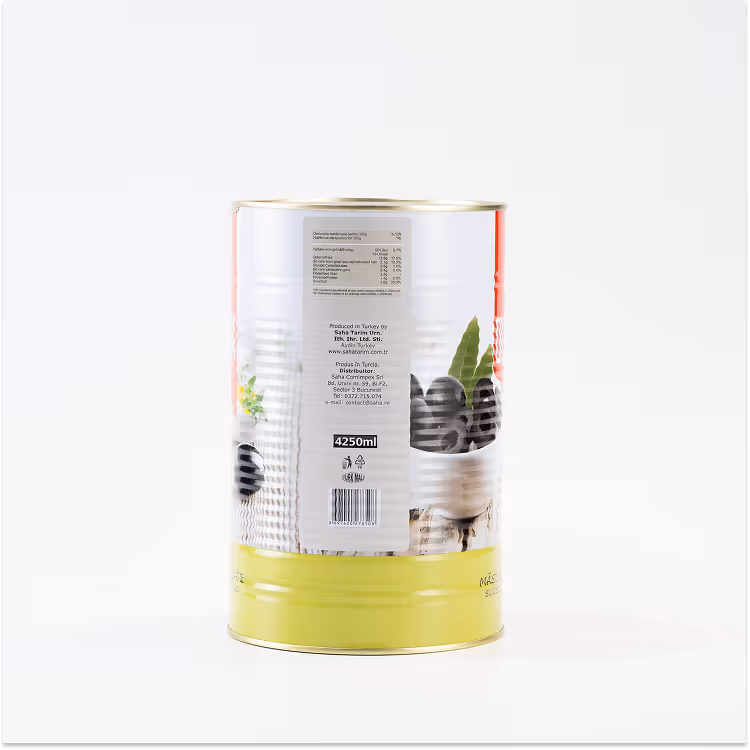 Măsline negre feliate, ambalate în cutie metalică 4250 ml / 4300g. Gust bogat, textură fermă, perfecte pentru pizza, salate și preparate HORECA.