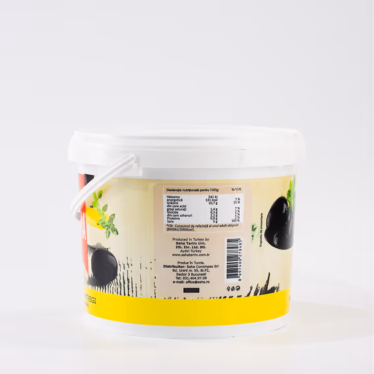 Măsline negre întregi, ambalate în găleată plastic 5500 ml. Gust bogat, textură fermă, ideale pentru platouri, salate și servire profesională în HORECA.