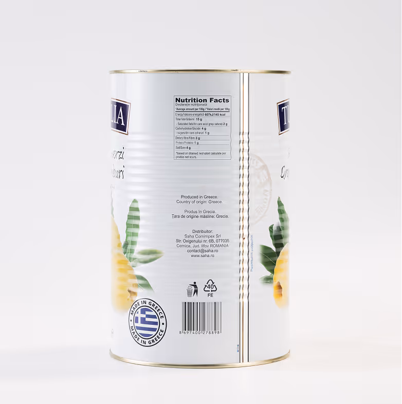 Măsline verzi fără sâmburi TULLIA, calibru 141-160 GIANTS, ambalate în cutie metalică de 5000 ml / 4400g. Soluția ideală pentru horeca, salate, platouri și preparate mediteraneene.