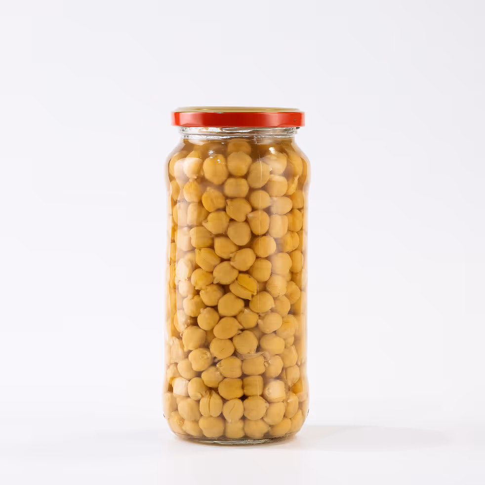 Năut Ethras, ambalat în borcan de sticlă de 580 ml / 580g. Sursă bogată de proteine vegetale, ideal pentru salate, humus sau mâncăruri rapide. Calitate superioară, perfect pentru retail.