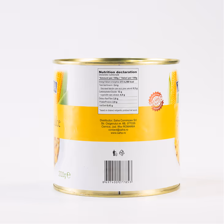 Porumbul dulce TULLIA, ambalat în cutie metalică de 3000 ml, cu o masă totală de 2200g și o masă scursă de 1775g, este alegerea optimă pentru bucătăriile profesionale horeca. Textura crocantă și gustul dulce fac ca acest porumb să fie potrivit pentru salate, garnituri sau rețete preparate în cantități mari. Ambalajul rezistent, capacitatea mare și termenul extins de garanție asigură eficiență și prospețime la fiecare utilizare. Produs recomandat pentru restaurante, catering și cantine.