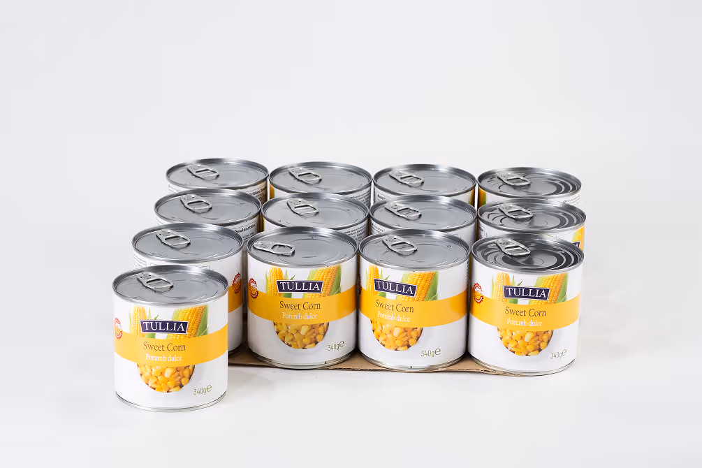 Porumb dulce TULLIA, ambalat în cutie metalică de 425 ml / 340g, perfect pentru salate, garnituri sau preparate rapide. Gust proaspăt, calitate garantată pentru retail.