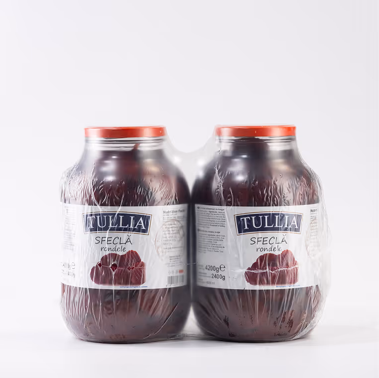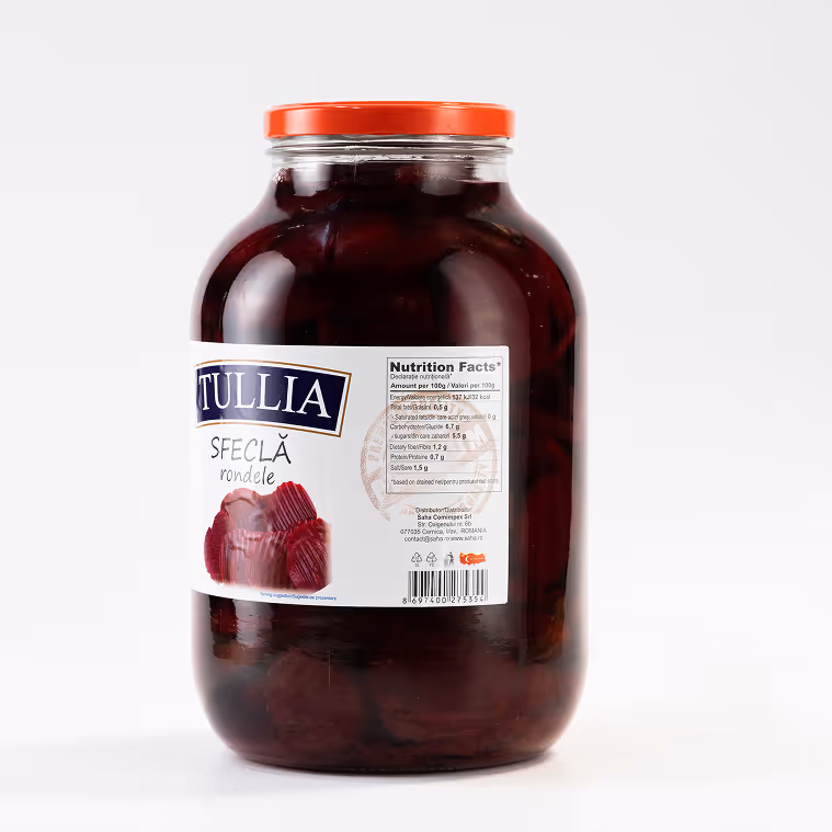 Sfeclă roșie în oțet, tăiată felii, marca TULLIA, ambalată în borcan de sticlă de 4000 ml / 4200g. Gust proaspăt și aromat, ideală pentru salate, meniuri horeca și catering.